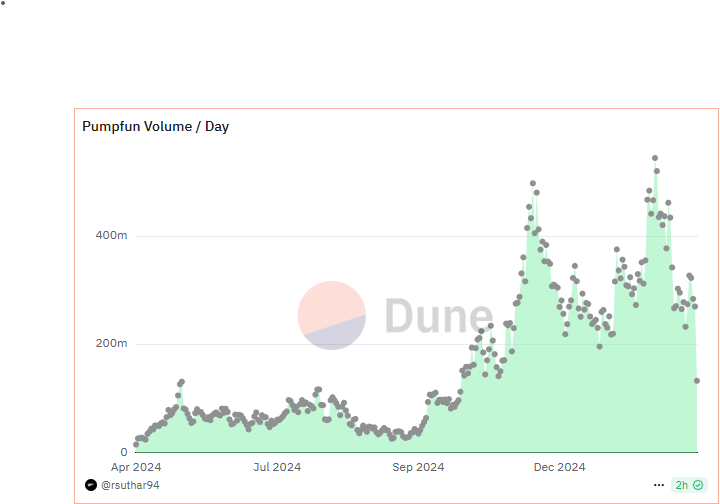 Solana-based token launchpad Pump.fun has experienced a significant decline in daily trading volume, dropping by 50% from its January 2025 high.